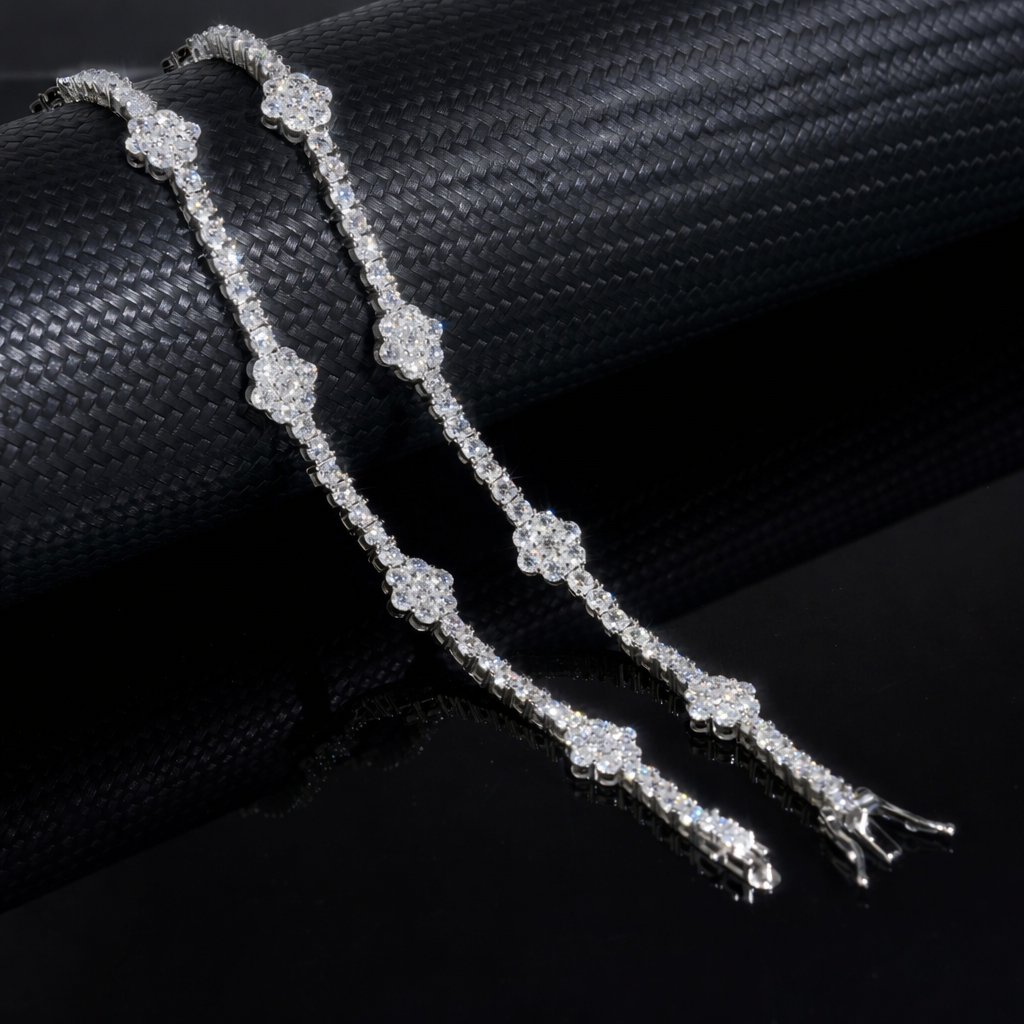 Elevate your wrist game with our Moissanite Flower Bracelet, crafted from solid 925 silver and finished in white gold, Each link is meticulously set with lab-grown moissanite – a gemstone that rivals diamonds in fire and durability, but without the premium price.